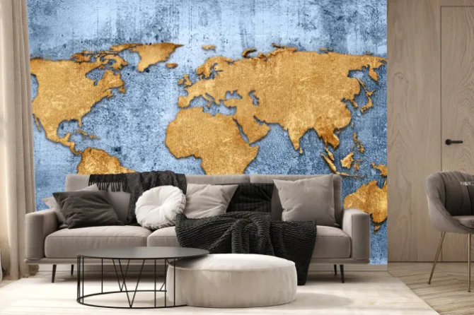 Fototapeta: Mapa świata na niebieskiej betonowej ścianie