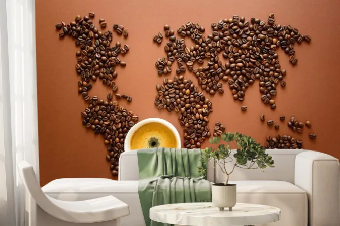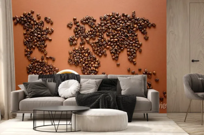 Fototapeta: Mapa świata z palonych ziaren kawy na brązowym tle papieru. międzynarodowy