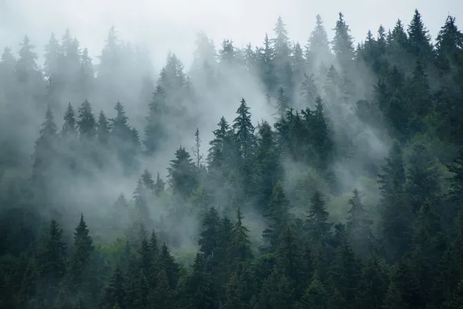 Mglisty krajobraz lasu w stylu retro.
