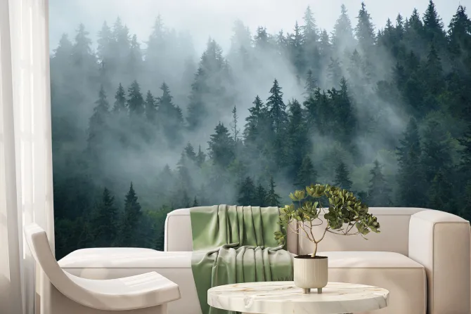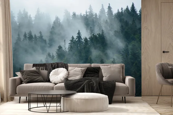 Fototapeta: Mglisty krajobraz lasu w stylu retro