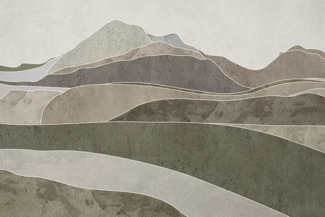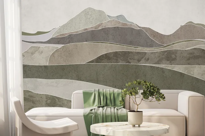 Minimalistyczny krajobraz górski abstrakcyjny wzór w zielono beżowych barwach.