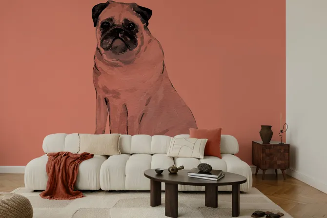 Fototapeta: Mops pies ilustracja w stylu akwareli na koralowym tle