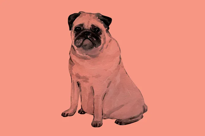 Mops pies ilustracja w stylu akwareli na koralowym tle.