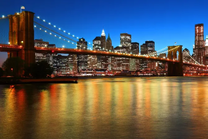 Most Brookliński o zachodzie słońca z panoramą miasta.