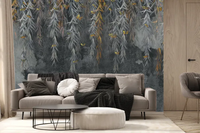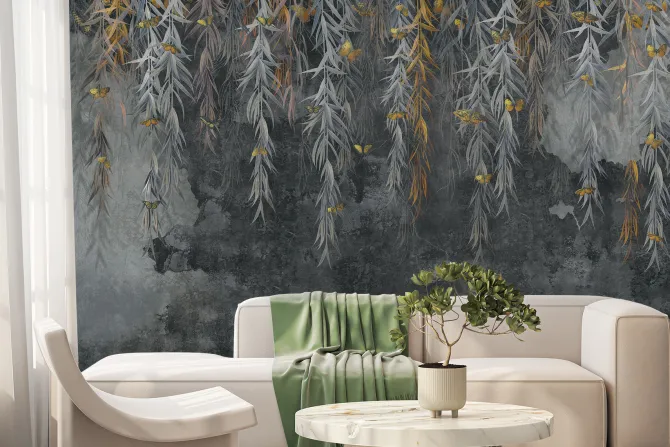 Fototapeta: Motyle i zwisające pnącza na tle surowego betonu nowoczesny wzór