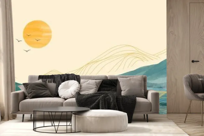Mountain landscape watercolor painting illustration with line art pattern. Abstract contemporary aesthetic backgrounds landscapes. mountains, hills, sun and skyline.