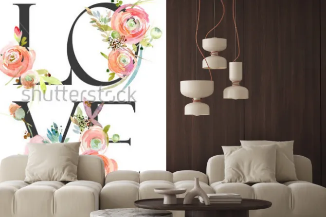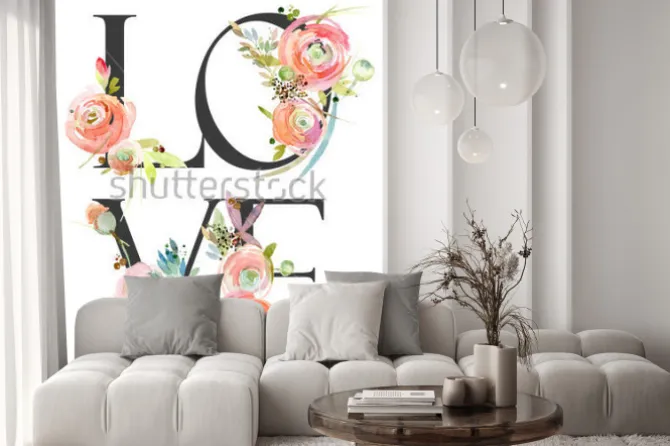 Fototapeta: Napis love z akwarelowymi kwiatami