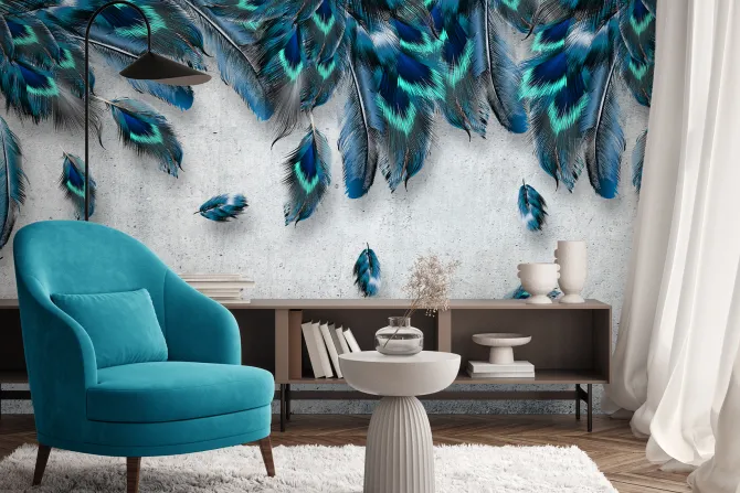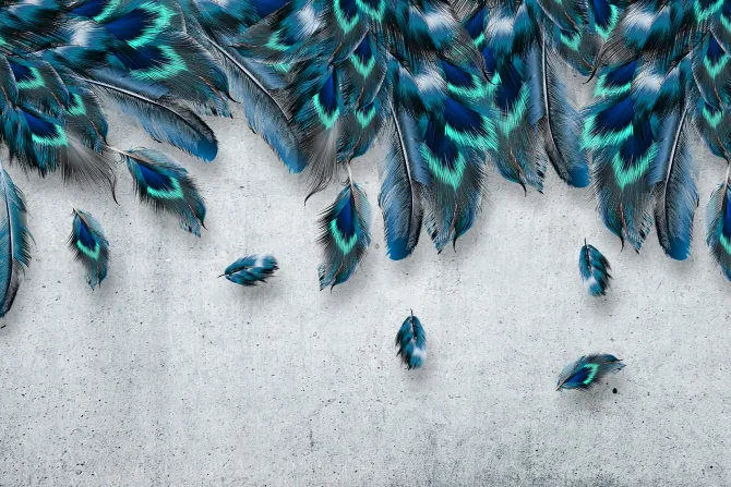 Fototapeta: Niebieskie pióra na szarym betonowym tle styl loft industrialny
