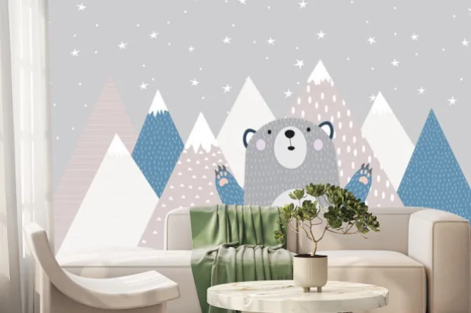 las, pokój dziecięcy, rysunek, zwierzęta, góry