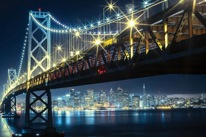 Fototapeta: Nocny krajobraz widok na most i oświetlone budynki