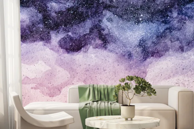 Obraz pełnoekranowy obraz nocnego nieba z fioletowym i różowym tłem akwareli.
