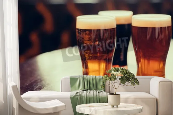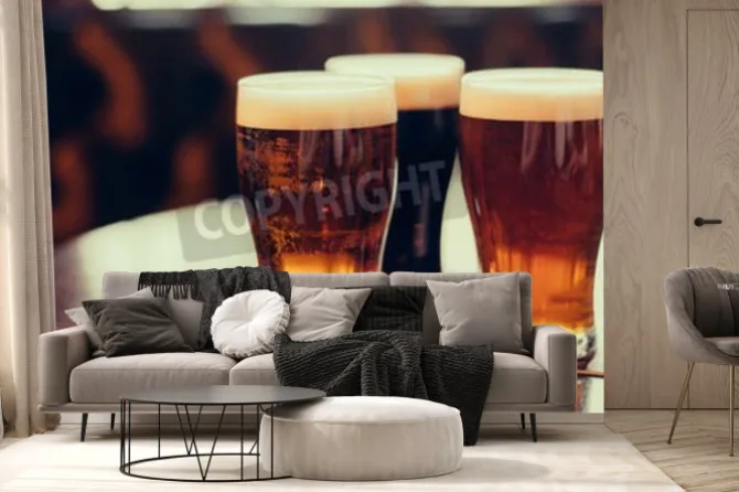 Fototapeta: Okulary z jasnego i ciemnego piwa na tle pubie.