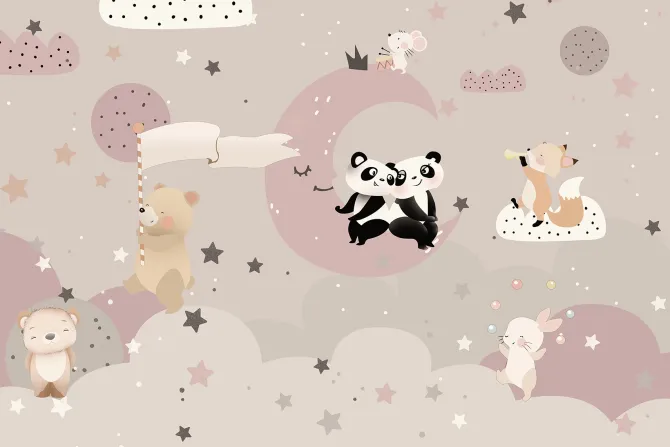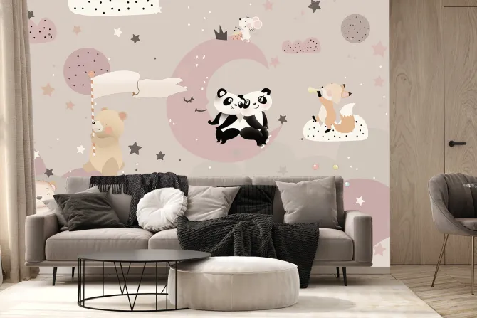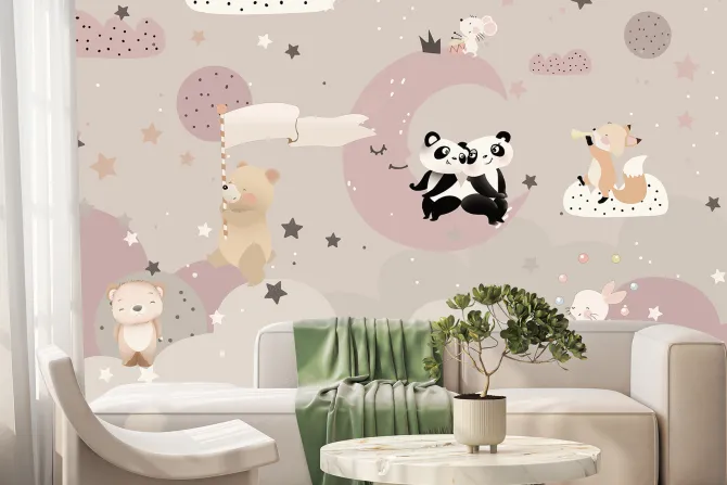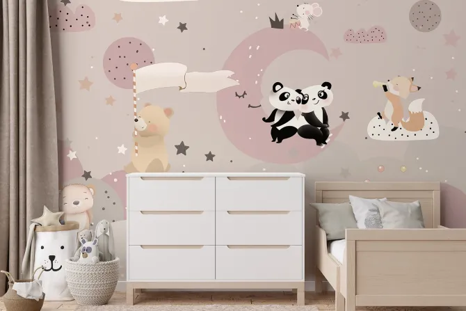 pokój dziecięcy, planety, gwiazdy, niebo, chmury, księżyc, miś, panda, lis