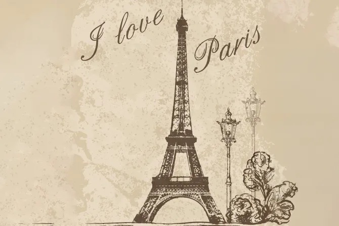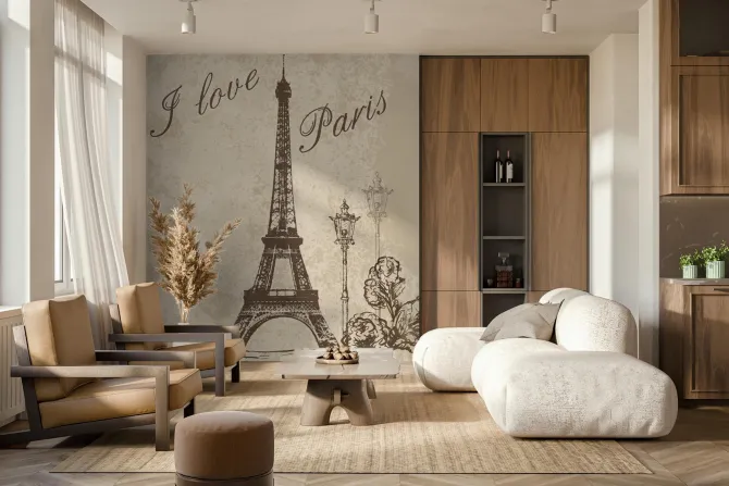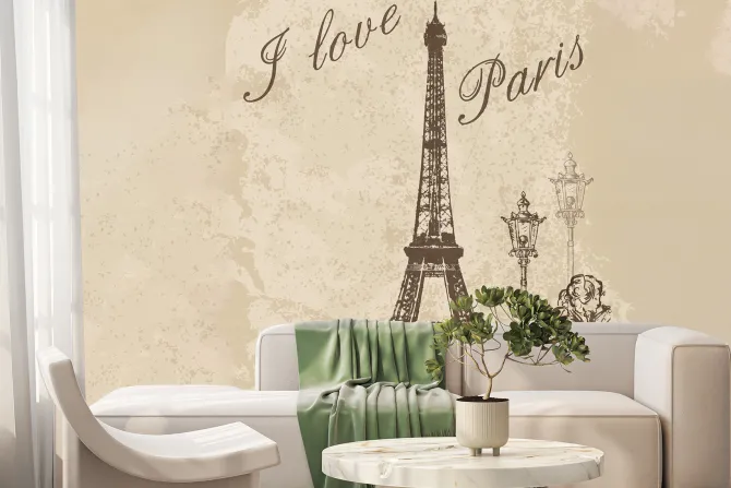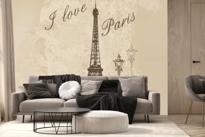 Paryski wzór z Wieżą Eiffla na beżowym tle.