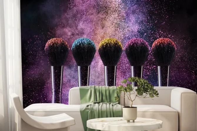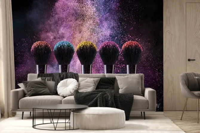 Fototapeta: Pędzle kosmetyczne i wybuchy kolorowe proszki.