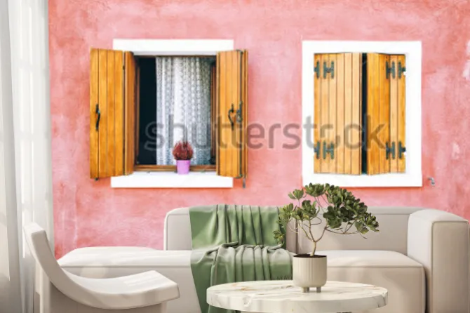 Piękna kolorowa domowa fasada na Burano wyspy, północne Włochy. Czerwone dwa okna z drewnianymi okiennicami.