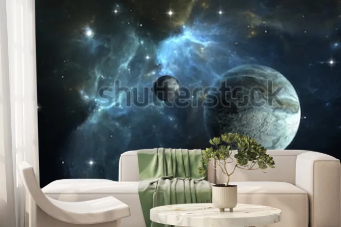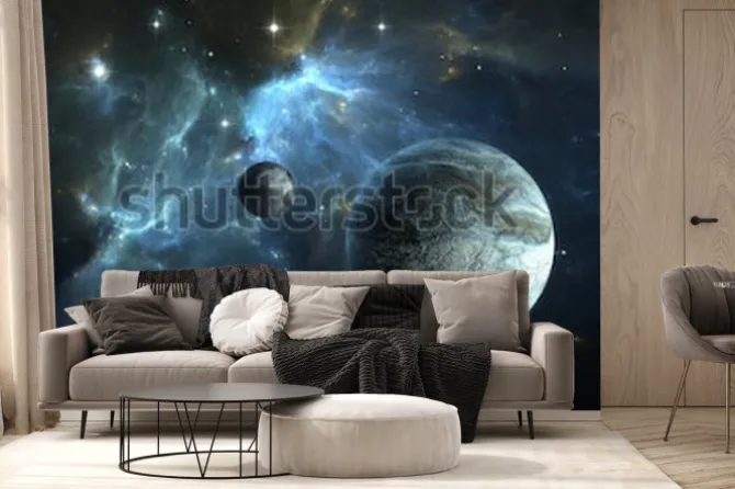 Fototapeta: Planeta pozasłoneczna. kamienna planeta z księżycem na mgławicy