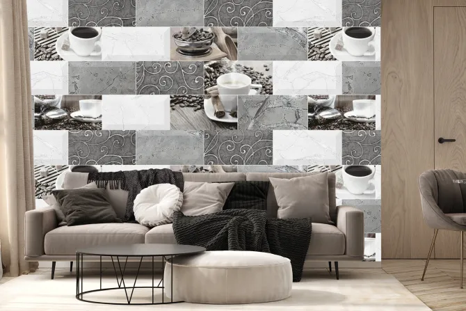 Płytki kuchenne z filiżankami kawy i ziarnami.