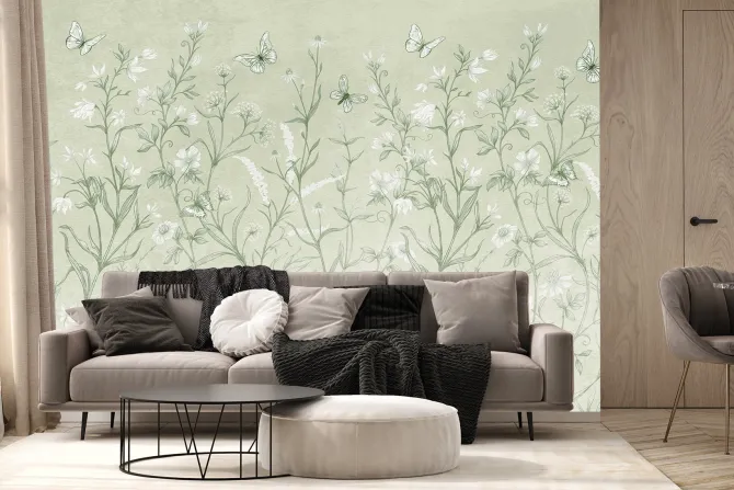 Fototapeta: Polna łąka z kwiatami i motylami w zieleni