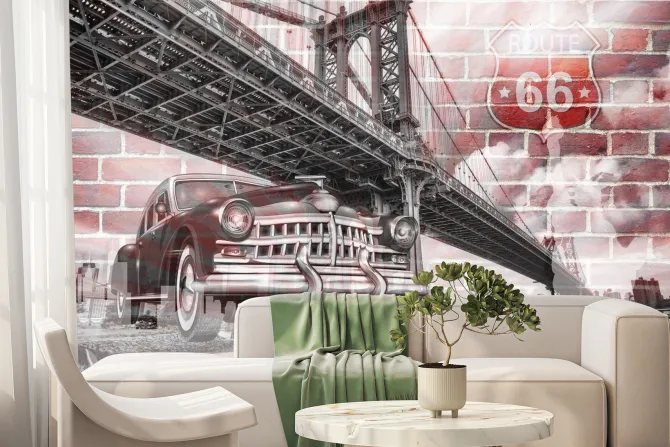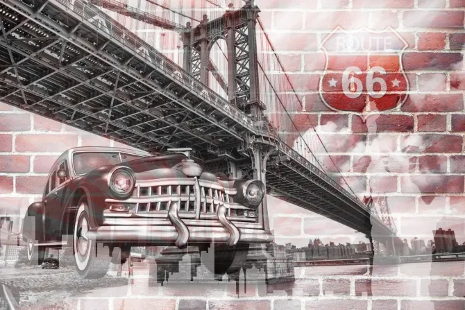 Retro samochód na tle mostu Brooklyn i Route 66.