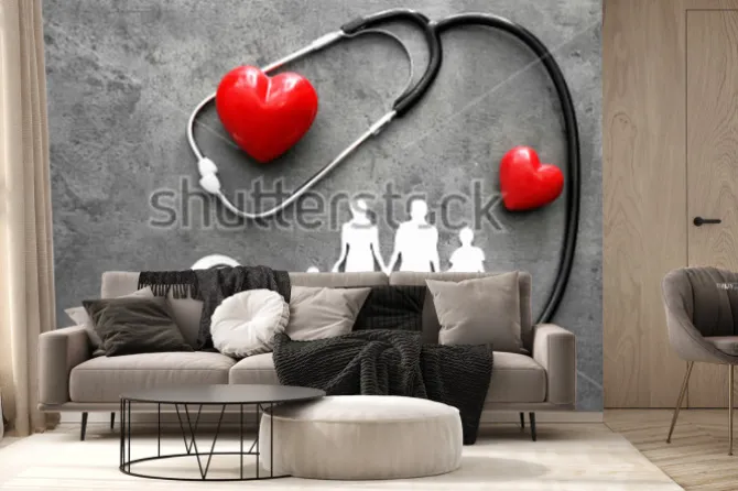 Fototapeta: Rodzinna postać, czerwone serca i stetoskop na szarym tle. pojęcie