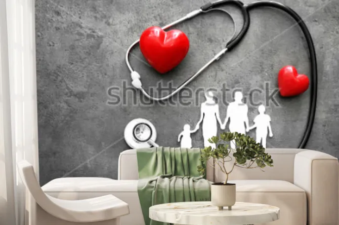 Rodzinna postać, czerwone serca i stetoskop na szarym tle. Pojęcie opieki zdrowotnej.