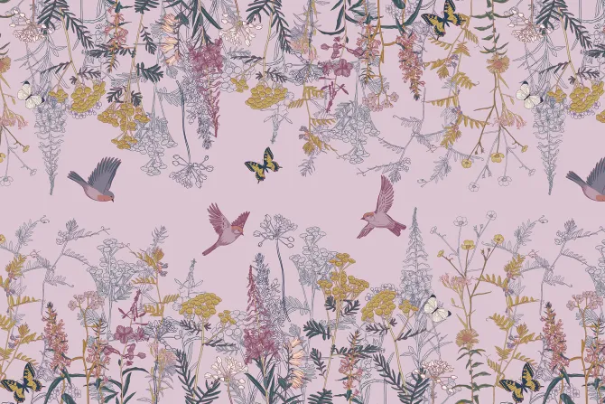 Fototapeta: Roślinny botaniczny motyw z kolorowymi kwiatami motylami i ptakami
