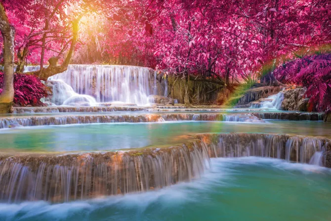 Różowe drzewa nad kaskadowym wodospadem.