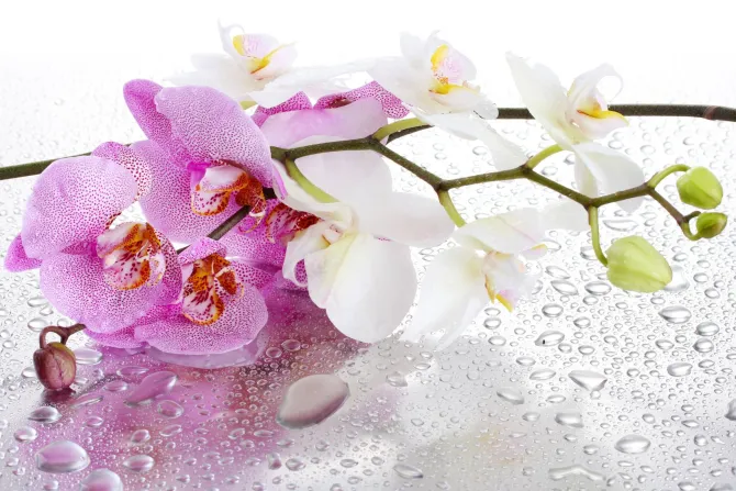 Fototapeta: Różowe i białe storczyki na kroplach wody