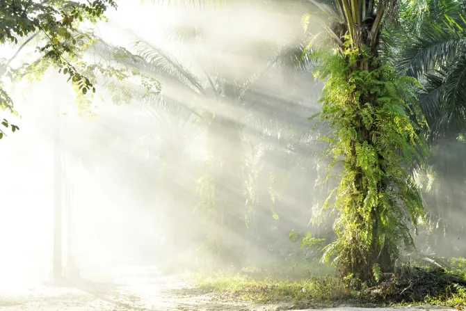 Słoneczny poranek w tropikalnym lesie z palmami.