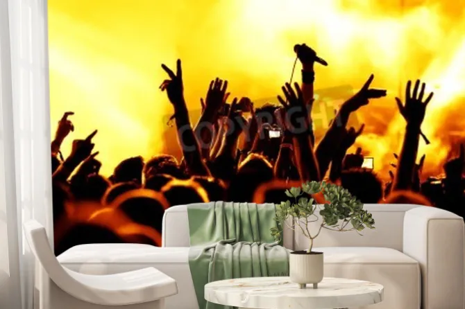 Fototapeta: Sylwetki tłumu koncertowego przed jasnym scenicznych świateł