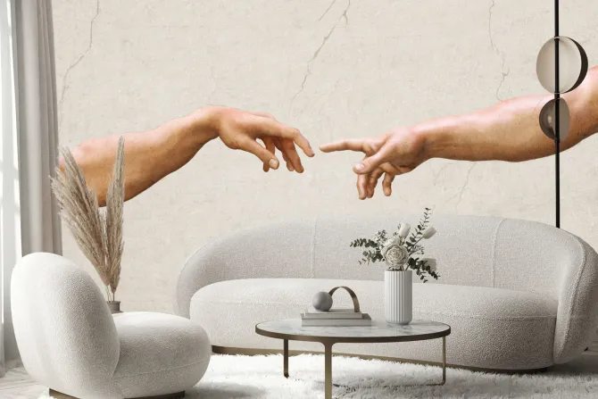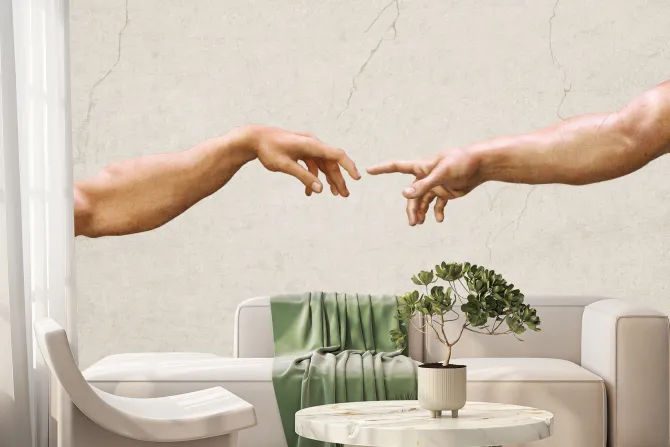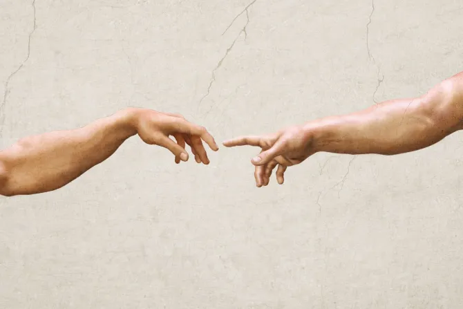 Symboliczny dotyk dłoni artystyczna kompozycja na tle betonu.