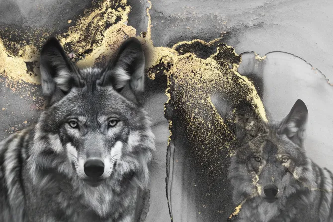 Fototapeta: Szary portret wilków ze złotym zdobieniem