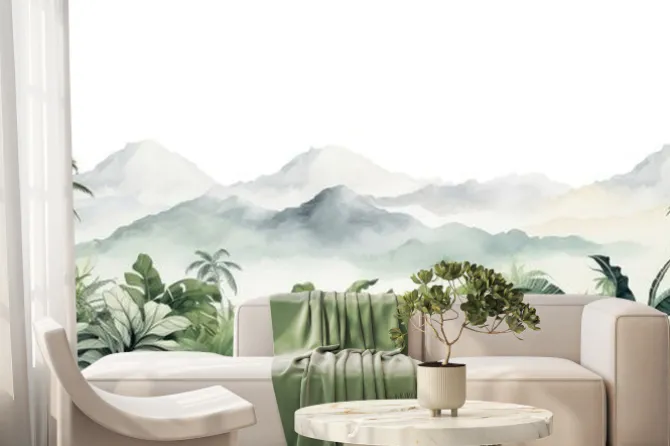 Tropical plant mural design trend in natural landscapes.