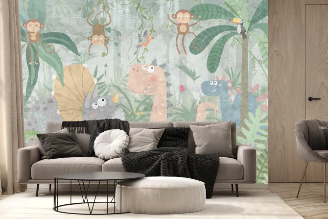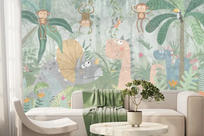 Tropikalna dżungla z dinozaurami i wesołymi małpkami.