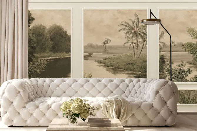 Fototapeta: Tropikalna rzeka z palmami w sztukaterii