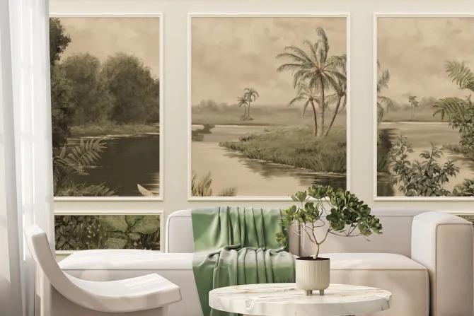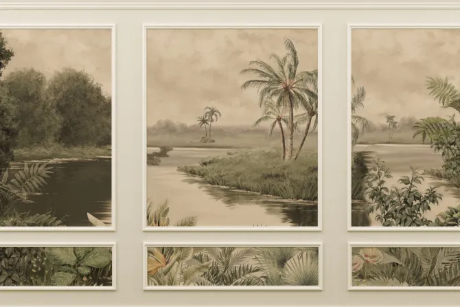 Tropikalna rzeka z palmami w sztukaterii.