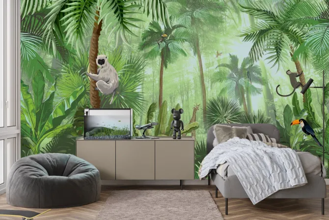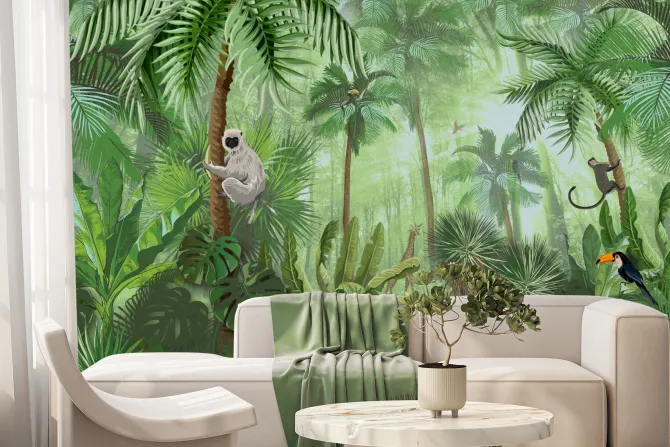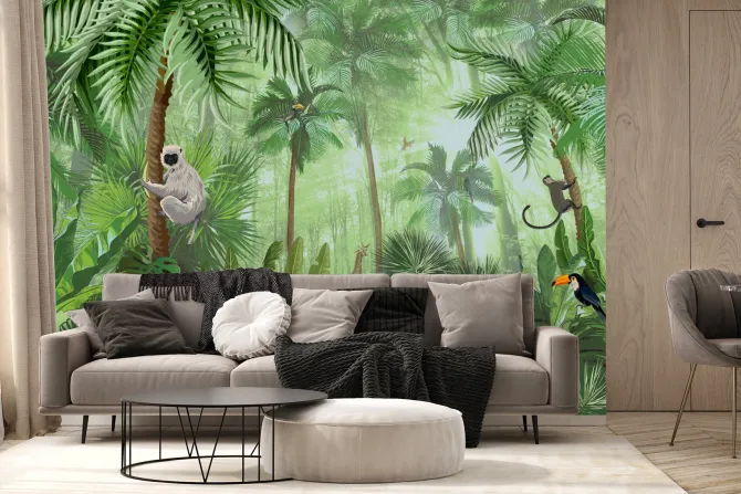 Fototapeta: Tropikalna zielona roślinność w dżungli ze zwierzątkami
