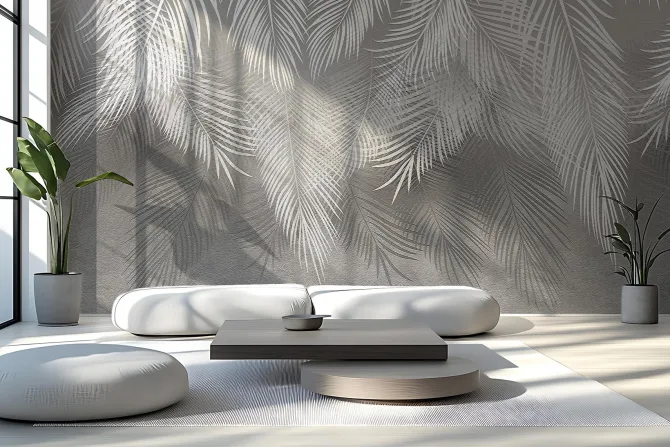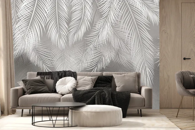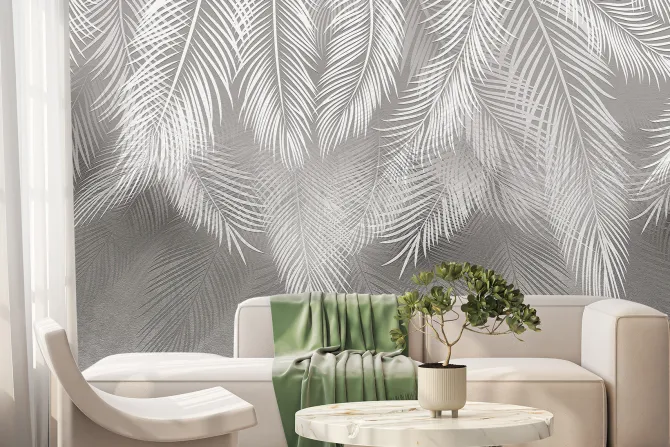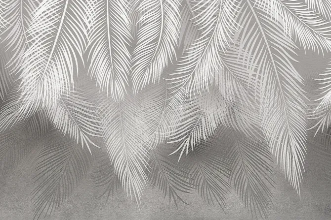 Tropikalne liście palmowe w bieli i szarości na tle z efektem betonu.