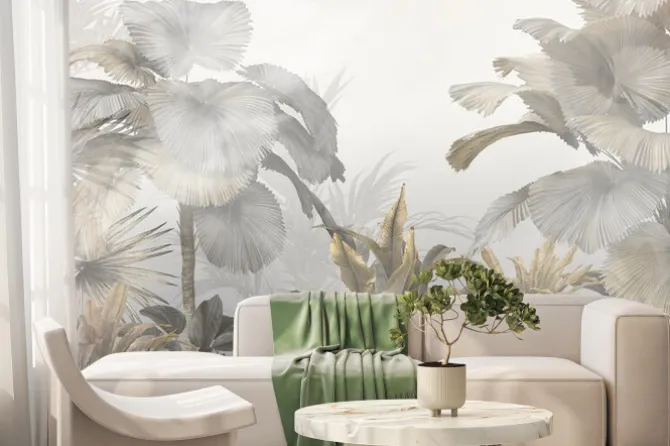 Tropikalne rośliny i liście w szarościach.
