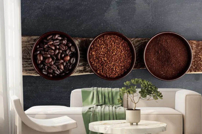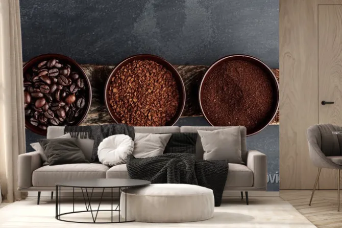 Fototapeta: Trzy rodzaje kawy: fasola, mielona, instant w filiżankach na