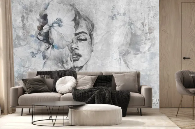 Fototapeta: Twarz kobiety z kwiatem na betonowym tle