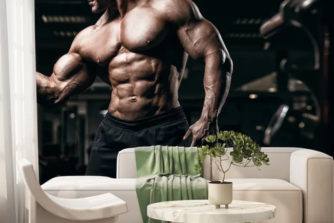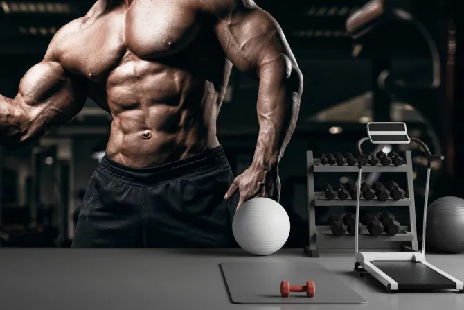 Umięśniony kulturysta trenuje na siłowni.
