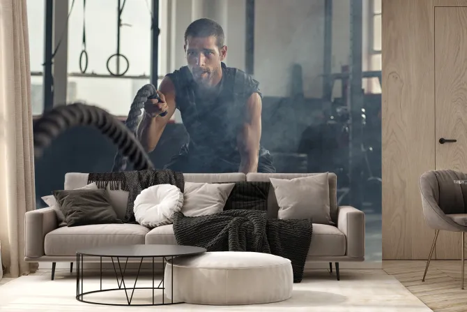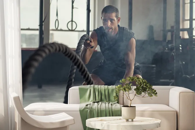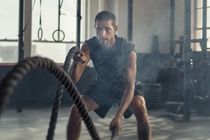Fototapeta: Umięśniony mężczyzna ćwiczy z liną
