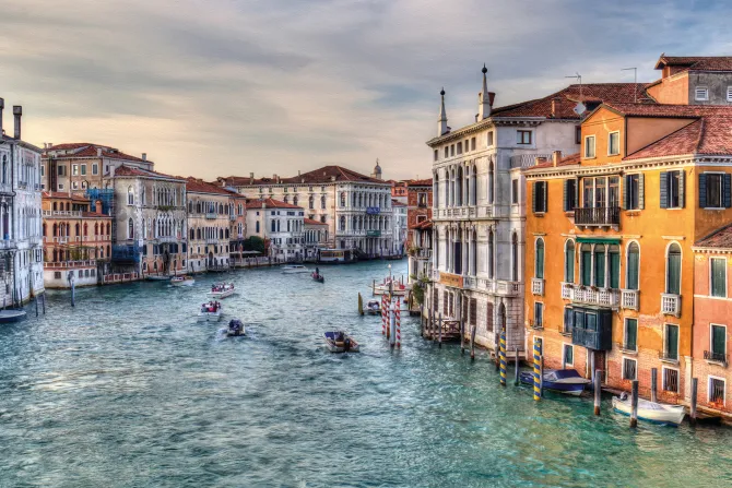 Wenecki kanał z łódkami wśród kamienic.