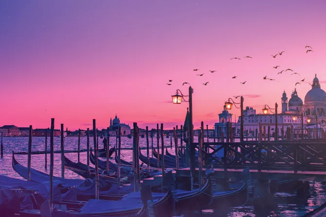 Fototapeta: Wenecki zachód słońca na tle gondol i katedry