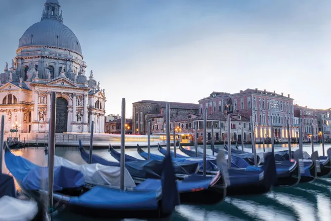 Weneckie gondole na tle oświetlonej katedry.