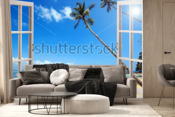 Fototapeta: Widok na tropikalną plażę z otwartego okna