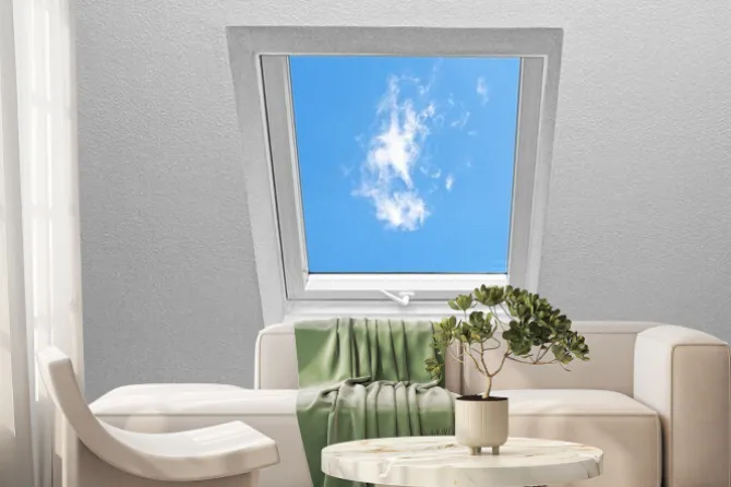 Fototapeta: Widok z okna na błękitne niebo i chmurę