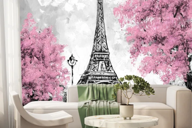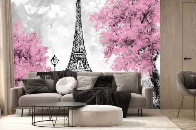 Fototapeta: Wieża eiffla z różowymi drzewami w malarskim stylu